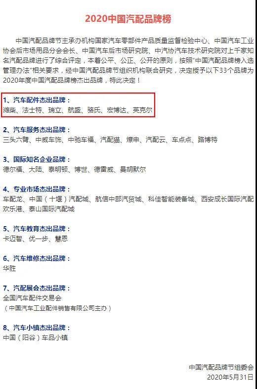 高質(zhì)量發(fā)展 與濰柴、博世等一起入圍中國汽配品牌榜杰出品牌